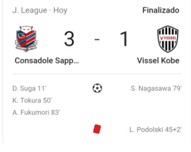 親愛なる友人は、私たちの仲間のANDRESが勝利を得ることはありませいる他のゲームは、それが街CONSADOLE SAPPORO前にしたこの時点では、チームは我々がチャンピオンズエリアに取得しなければならなかった4位を獲得することができました。 他には何も始まって​​いない:ホームは、KIMが大きなストップを作ってくれるヘッドコーナーのオークションの後、私たちに良い恐怖を与えた。 家の右側の開口のための時間にされていないポドルスキ貧しいカバレッジは、D. SUGA(11' )を介してリードしてCONSADOLE上昇の最初の目標のためのセンターを打ちました。 キー(47' )にあったポドルスキ中盤は醜いが、審判はレッドカード、ゲームを克服するために有効に面し不利な立場に私たちを残しヴィッセル正面玄関で罰せられるこれに取り組むことができます。 第2の部分が始まり、ホームチームは危険を伴い続けた。その結果、K.OKURASは左からのボレーの中心から(50 ')ショットで差を広げた。 その後、既に2-0アップとアンドリューは、ウェリントン(54' )で、この場合、正面によって変更されます。 ホームゴールキーパーがゴールライン上でプレスS.NAGASAWA(79' )に拒否した後、COBE、右サイドからのコーナーキックの終了のため、危険と遊びに主演していなかったが、カムバックは、可能なように見えた2 -1。 そして最後のショットは、A.福井がゴールキーパーを含む障壁のすべての構成要素を捉え、3-1を(83 ')に入れるという欠陥だった。 まあ、友人、悪い試合、チームの今回は、それはライバルに幾分優れた所有権を持っていましたが、それは危険なしの所有だった。